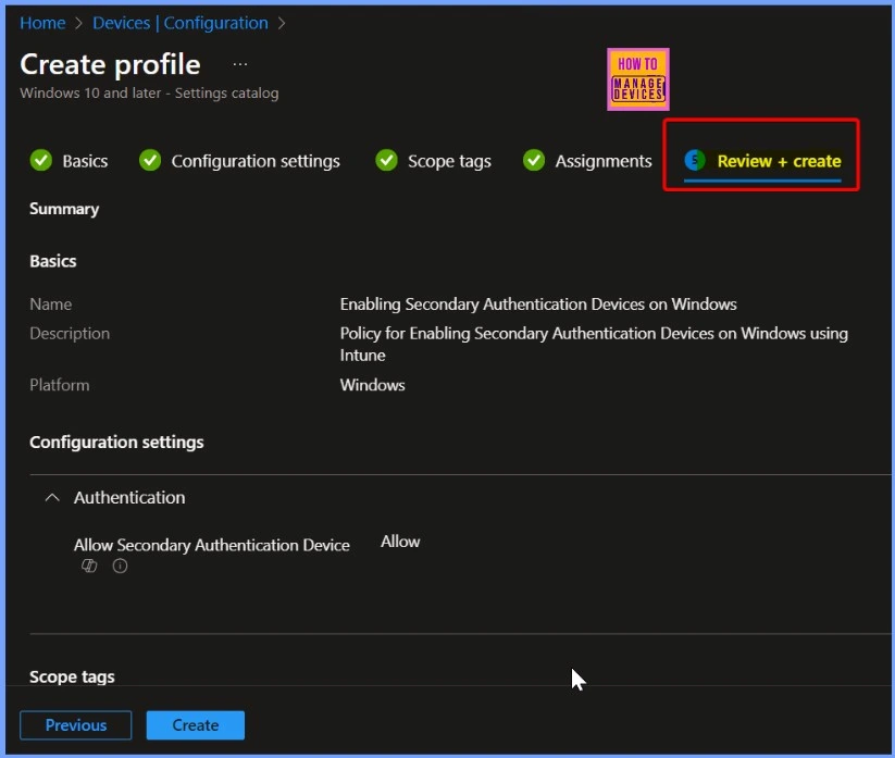 The Review + Create tab is the final step in the Intune profile creation process. Here, you review all the settings and configurations you’ve applied to ensure everything is correct before creating the profile.