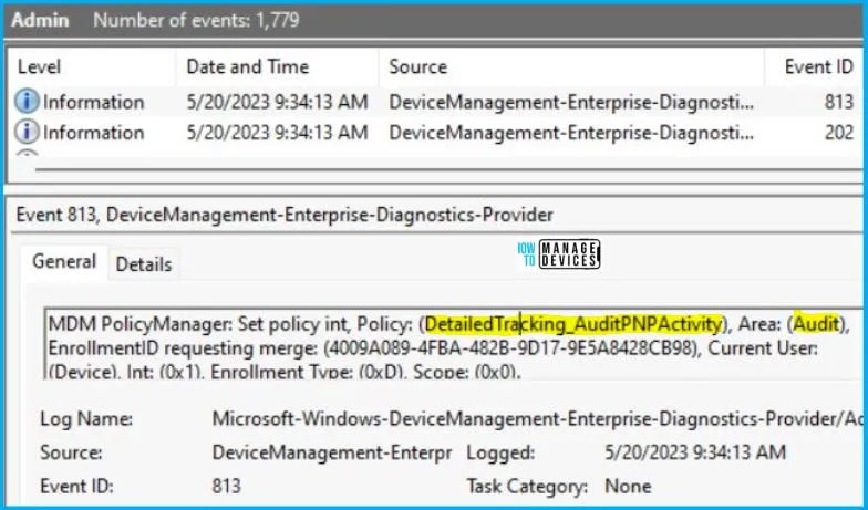 To confirm this, you can check the Event log path – Applications and Services Logs – Microsoft – Windows – Devicemanagement-Enterprise-Diagnostics-Provider – Admin.