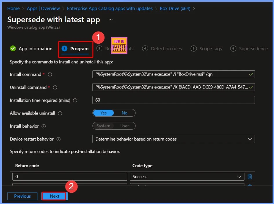 When updating Box Drive (x64) to a newer version, Intune uses the Enterprise App Catalog to define app settings. Before updating, you can review and customize the settings, and it’s a good idea to export the app’s properties. Superseding the app replaces the old version with the latest one, but some settings, like scope tags and assignments, won’t be copied to the new app.