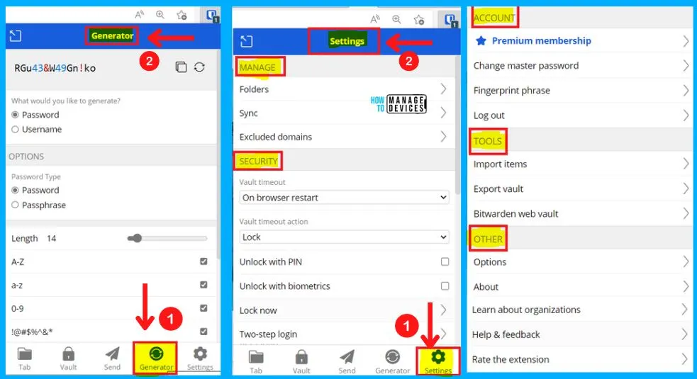 The Generator tab in Bitwarden helps you to generate a password or passphrase for your Bitwaden Login. The Settings tab in Bitwarden shows the options such as Manage, Security, Account, Tools, and others.