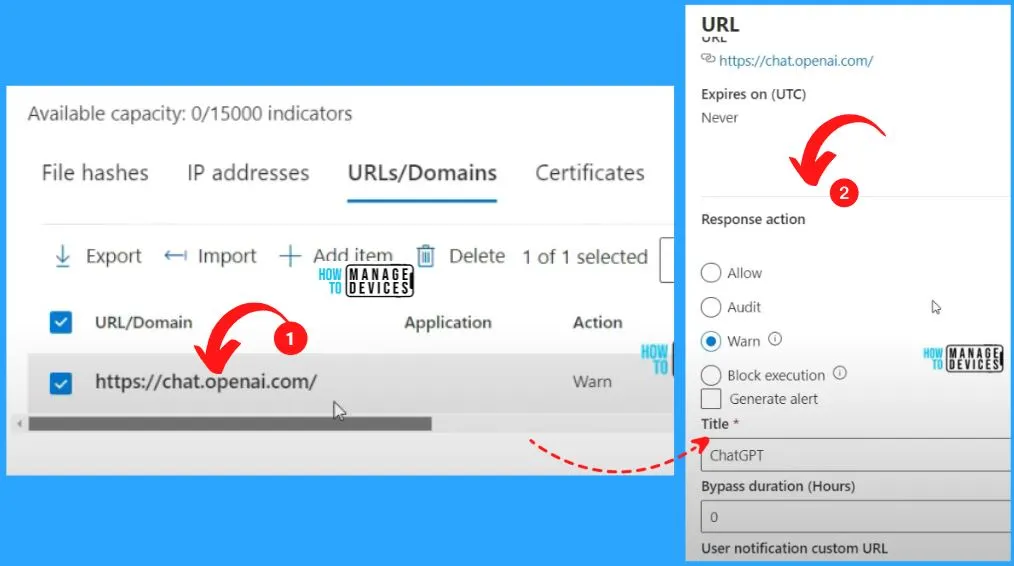 When you create Custom indicators, Warn and Block currently work only with Windows devices. The maximum Indicator that you can create is 15000. The Policy change and new policy (update) propagation time are 2 hours, as per Microsoft.