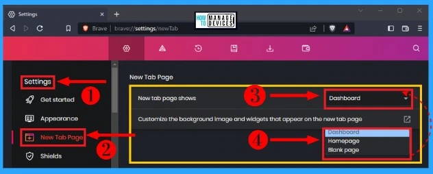 The New Tab Pages option in the Settings menu helps to show new pages in the Brave browser. You can easily select the New Tab Pages option by Selecting the Settings option. After selecting New Tab Pages, select the drop-down arrow from the left corner of the below Window.