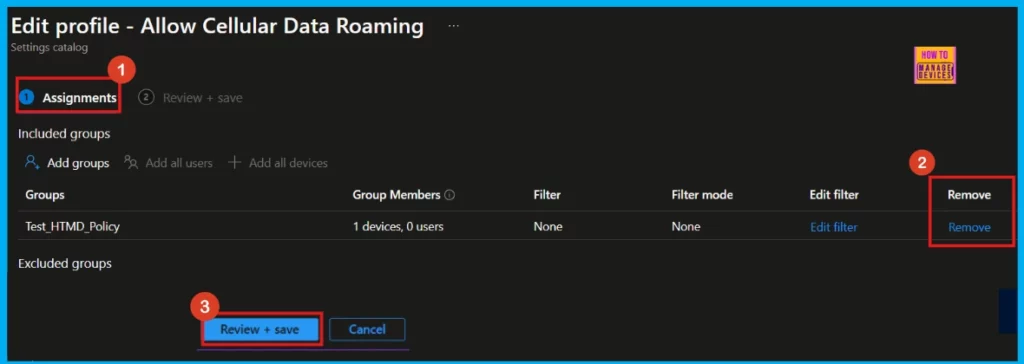 Removing a group assigned to a policy is frequently required for reasons like security updates or improved operational workflows. The following screenshot demonstrates the process of removing an assigned group from the policy. Once the removal is complete, remember to click Review + Save.