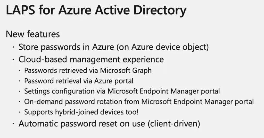 Microsoft LAPS for AzureAD will have the ability to store passwords of AzureAD joined devices on the AAD device object, Cloud-based management experience, passwords retrieved via Graph, Azure portal, or rotated through Intune settings configuration, and more.