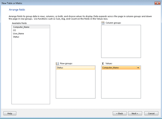 Click the Insert>>Matrix>>Matrix Wizard to create a Pivot table for the status tab.