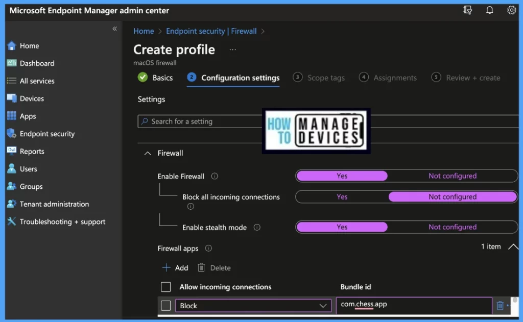 - Endpoint security policy for macOS Firewall – The Firewall profile in Endpoint security is a focused group of settings dedicated to configuring Firewall.