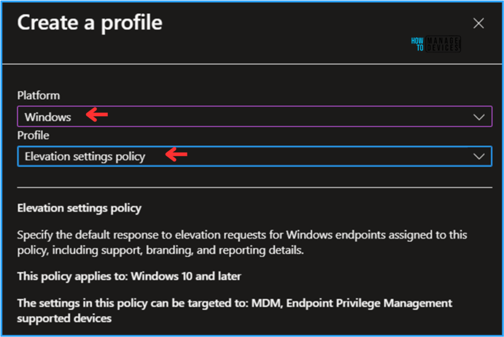 Under the Create a profile window, choose Platform as “Windows“, and the Profile is “Elevation settings policy” One more Profile is available in EPM; the “Elevation rules policy” configures specific predefined rules to support our Elevation settings policy. Here, we are only talking about the Elevation settings policy.