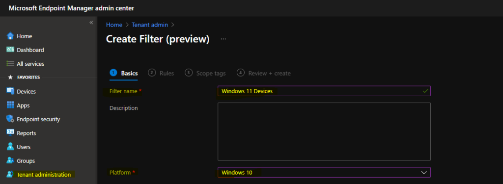Let’s create the Windows 11 filter rule in Intune or MEM admin center portal. The process of filter rule creation is similar to other workflows in Intune. The main difference comes when you build the logic for the Windows 11 filter rule.