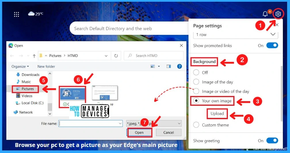 - Click Open to upload the image as your main image in the Edge browser
