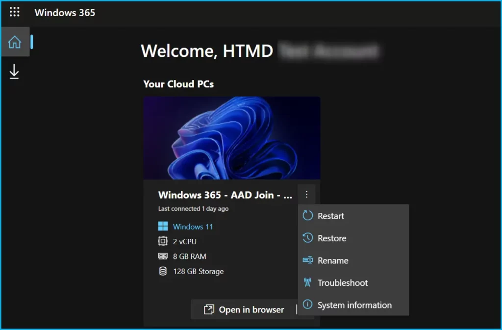 The end-user gets an option to launch their personalized Windows desktop from the Cloud PC service. The end-user needs to click on the Open in Browser option to launch the cloud PC. Let’s check more details about Windows 365 Cloud PC web client end-user experience walkthrough, Windows 365 Cloud PC Web Client End User Experience.