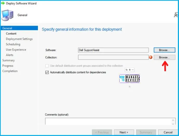 After this, Deploy Software Wizard opens, and in the General Tab, enter the Name of the Application and click on Browse to select the Collection.