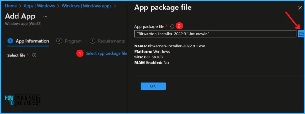 On the Add app pane, click Select app package file. Select the browse button. Then, select the prepared file with the extension .intunewin. The app details appear. When you’re finished, select OK on the App package file pane.