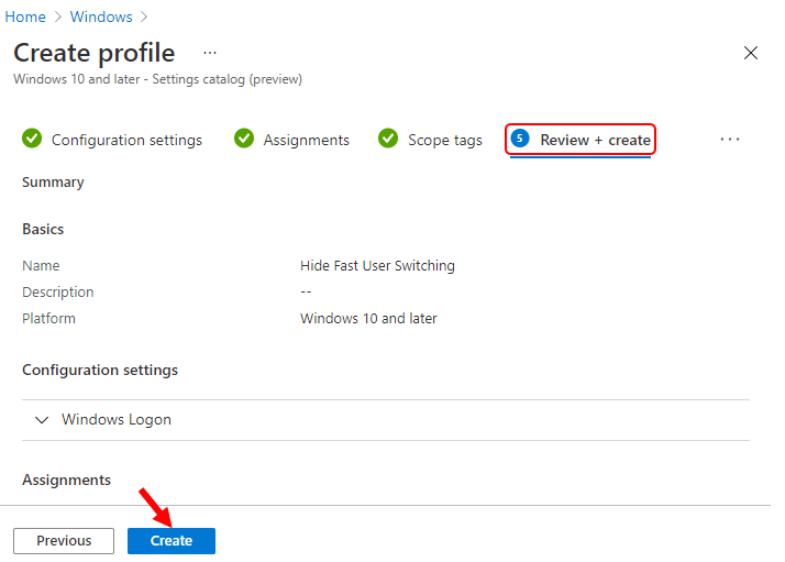 In Review + create, review your settings. When you select Create, your changes are saved, and the profile is assigned.