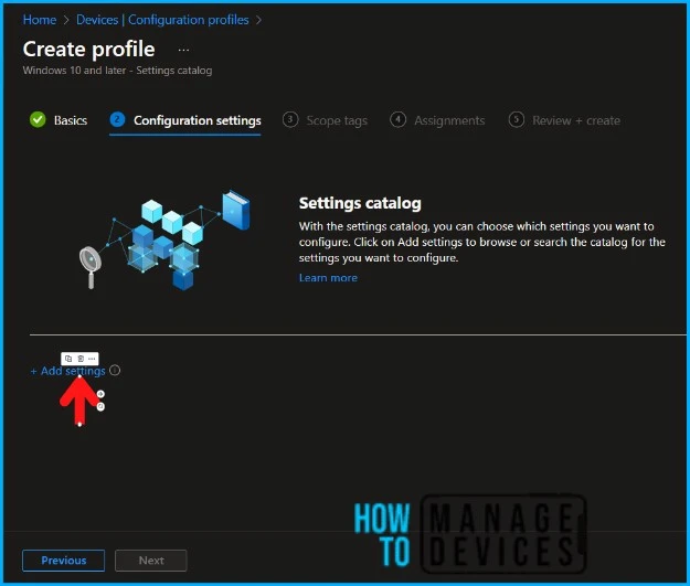 In the Configuration Settings section, under Settings Catalog, click Add Settings.