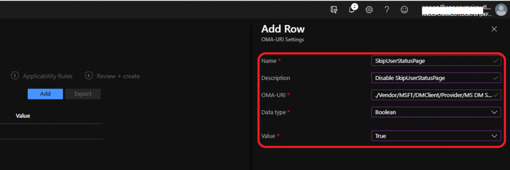 - OMA-URI: ./Vendor/MSFT/DMClient/Provider/MS DM Server/FirstSyncStatus/SkipUserStatusPage