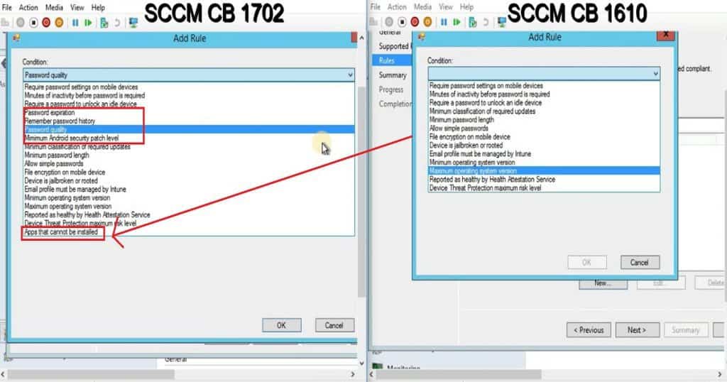 Another excellent news for SCCM CB hybrid customers is that there are some great 5 new additions to Compliance policies! We can’t select the different versions of the Android and iOS platforms anymore while creating a compliance policy or configuration policy with SCCM CB 1702. Granularity in choosing different Android/iOS versions was removed. New compliance policies are.