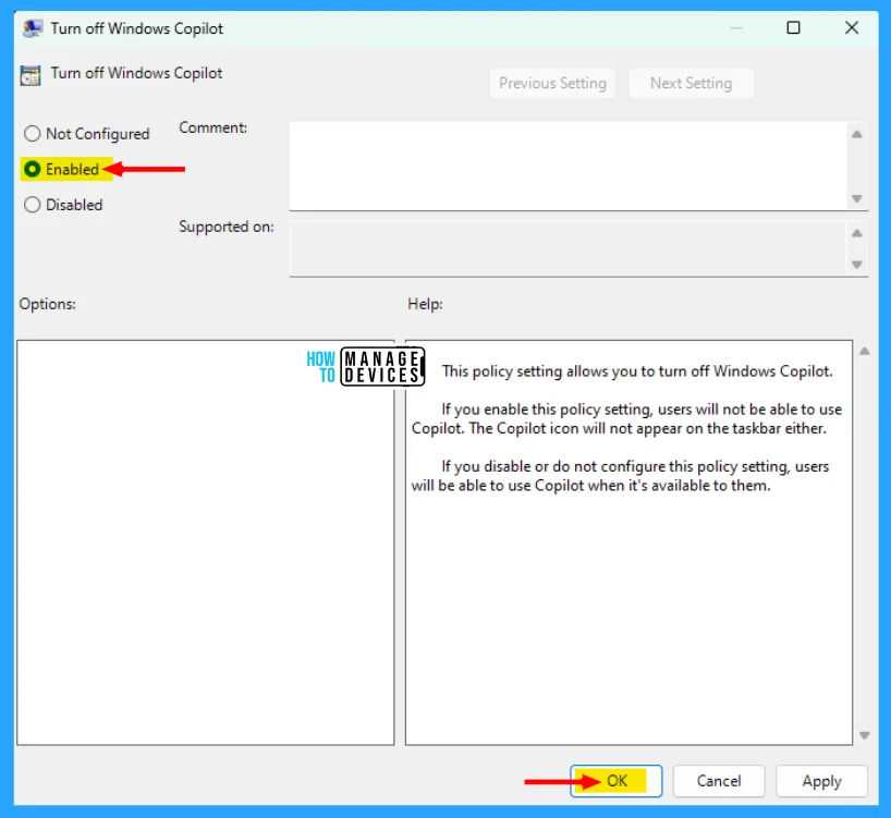 This policy setting allows you to turn off Windows Copilot. If you enable this policy setting, the user cannot use Copilot. The Copilot icon will not appear on the taskbar either. If you disable or do not configure this policy setting, users will be able to use Copilot when it’s available to them.