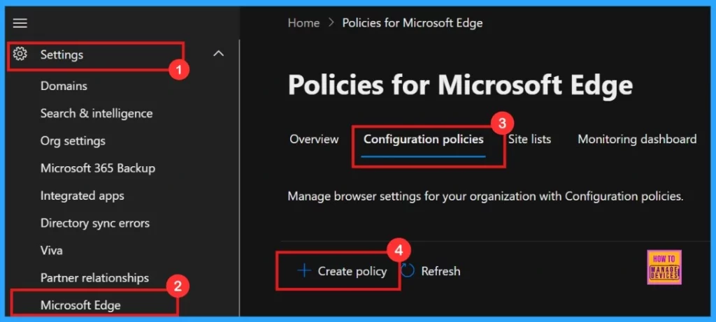 - Microsoft 365 Admin Center > Settings > Microsoft Edge > Configuration Policies > Create policy.