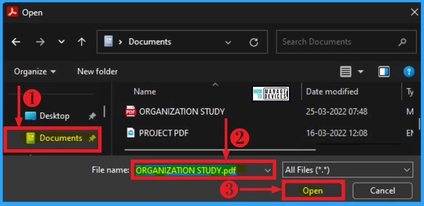 After that, file explorer will open for selecting any file. You can select a file from it for adding signs. An organization study PDF is selected here from the documents folder. Then click on the Open button. The below screenshot shows how to select a file from file explorer to add a sign.