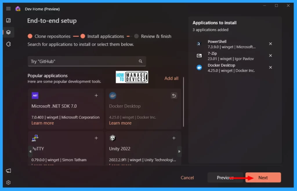 - Application Installation: It makes finding and installing new software applications easy. You can install apps one at a time or let Dev Home install multiple apps when you take a break.