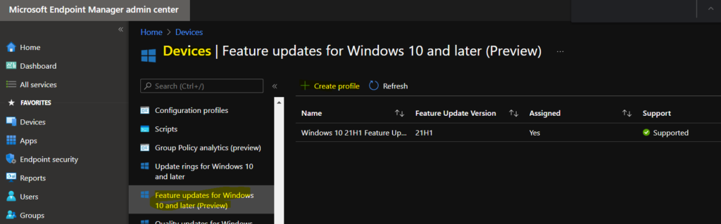 - Navigate to Devices – Feature updates for Windows 10 and later (Preview)