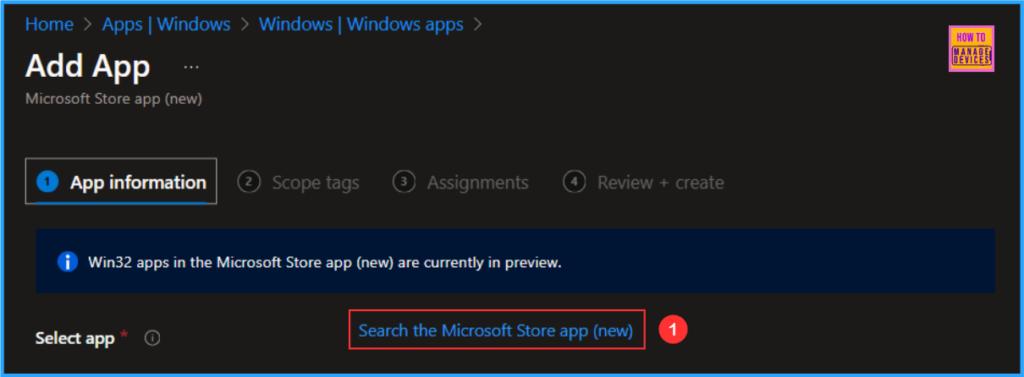 Now we can get the App information page. There is a hyperlink available to Select an app. Click on Search the Microsoft Store app (new).