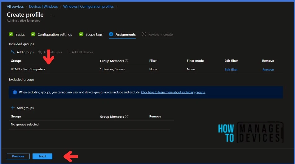 Click Next to display the Scope tags page. Add the Scope tags if you wish and click Next to assign the policy to computers. I will deploy it to the HTMD – Test Computers Group.