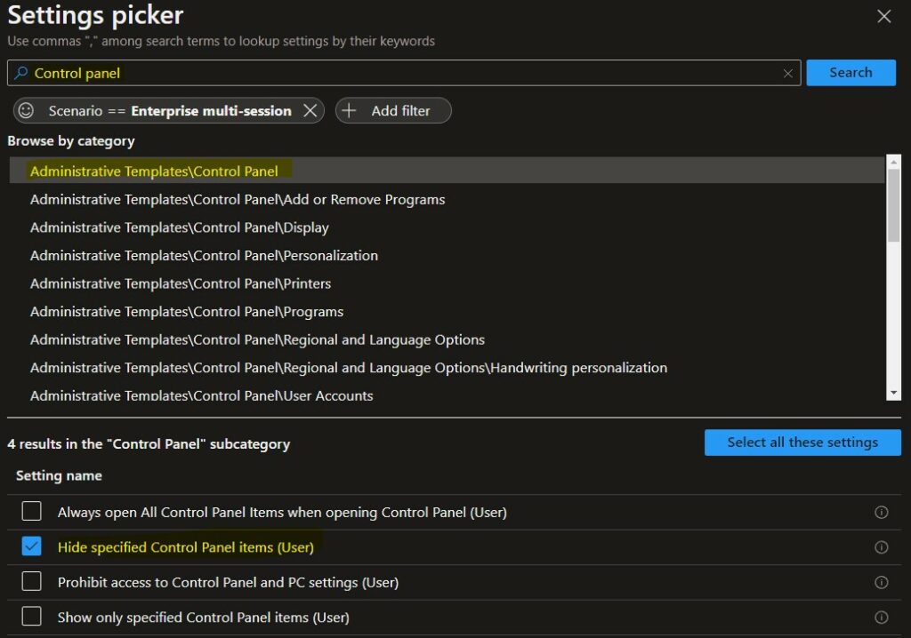 I used the keyword “Control panel” to filter down the policy results further. Remember, I have already filtered down for a multi-session OS version.