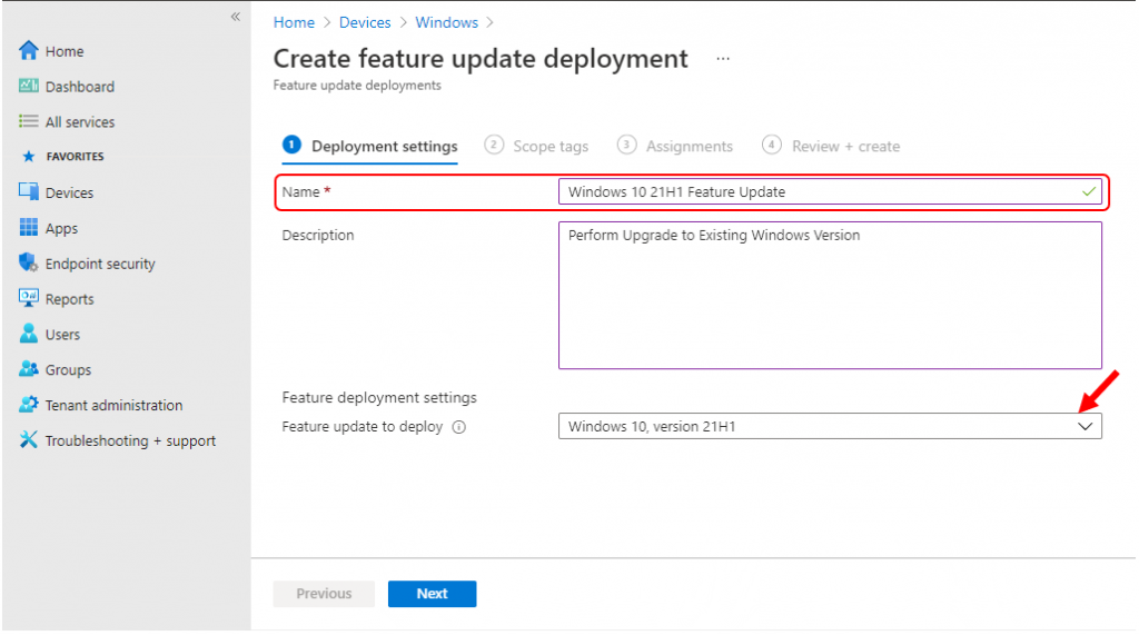 Specify a name and a description (optional), and for Feature, update to deploy. Then, select the version of Windows with the feature set you want from the drop-down list and select Next.