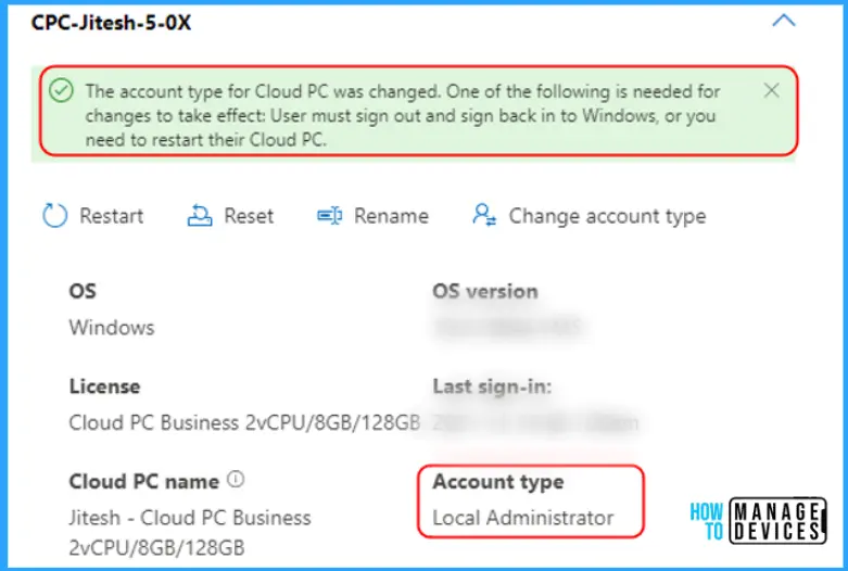 You will see the message “The account type for Cloud PC is being changed” After completion, you will get the below message as shown below. Once you perform the sign-out or restart to Cloud PC, You can also validate the Account type under devices.