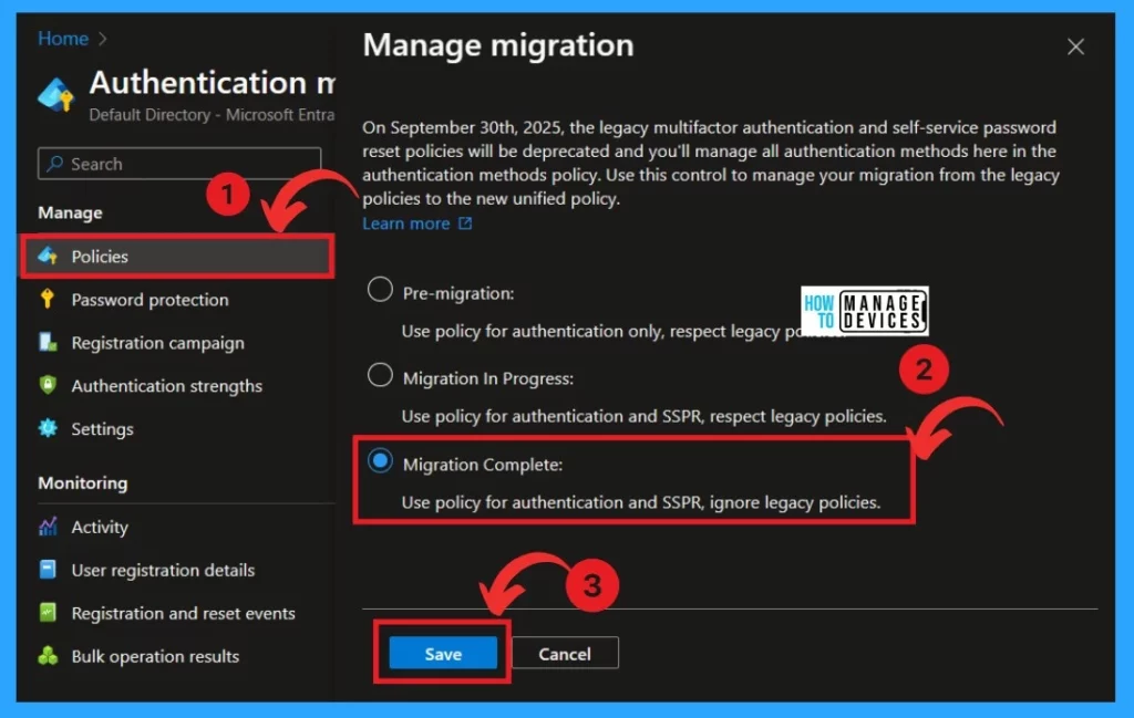 When you click on the Manage migration(”On September 30th, 2025, the legacy multifactor authentication and self-service password reset policies will be deprecated, and you’ll manage all authentication methods here in the authentication methods policy. Use this control to manage your migration from the legacy policies to the new unified policy’‘)