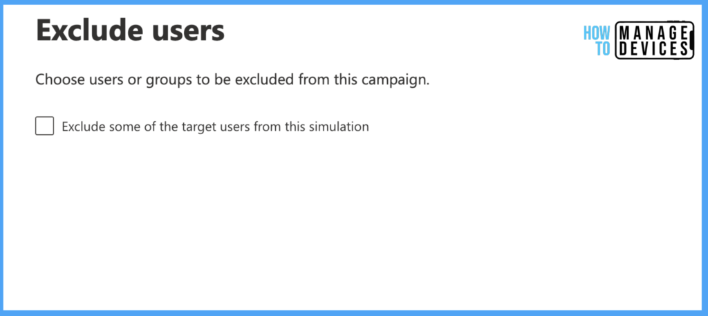 I have selected “Include only specific users and groups” and selected a user. Now click Next to exclude specific users or groups if you want to exclude them from the attack simulation on the Exclude Users page. I don’t have users to Exclude, so I proceeded further without excluding any users.