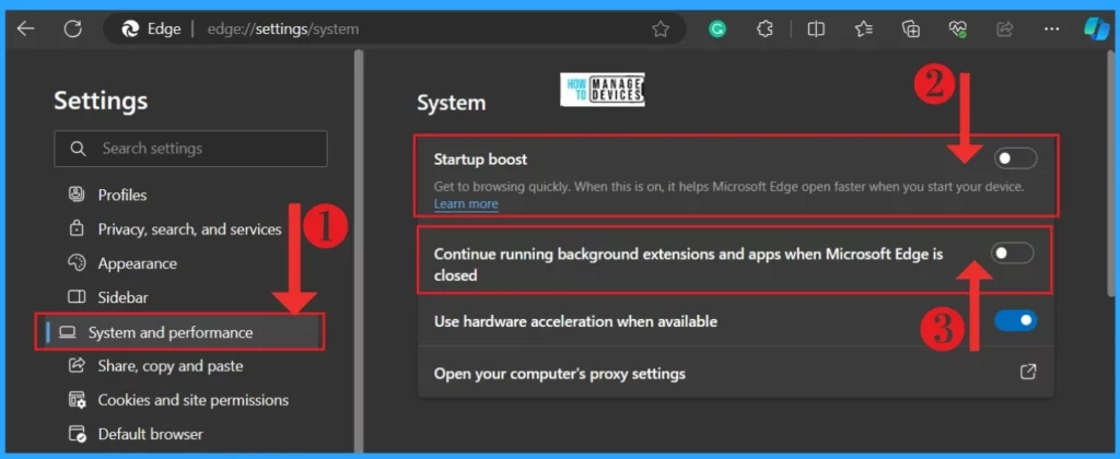 Startup Boost feature in Microsoft Edge This feature helps the browser open quickly. This consumes more power from your device. Disabling this option will help the battery drain issue. To disable this option, follow the steps below.