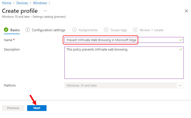 On the Basics tab, enter a descriptive name, such as Prevent InPrivate Web Browsing in Microsoft Edge. Optionally, enter a Description for the policy, then select Next.