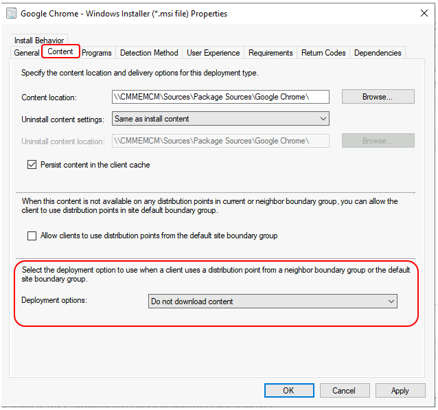 - Switch to the Content tab, Under Deployment options, you can specify if clients should download the application when using a distribution point from a neighbor or the default site boundary groups.