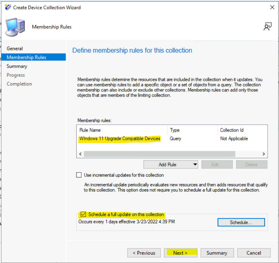 NOTE! – You can configure multiple rules for each collection if there is a requirement. This is not required for Windows 11 upgrade compatible devices collection.