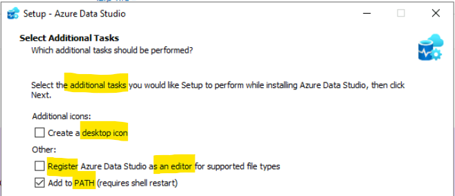 You can select the additional tasks you would like ADS setup to perform while installing Azure Data Studio.