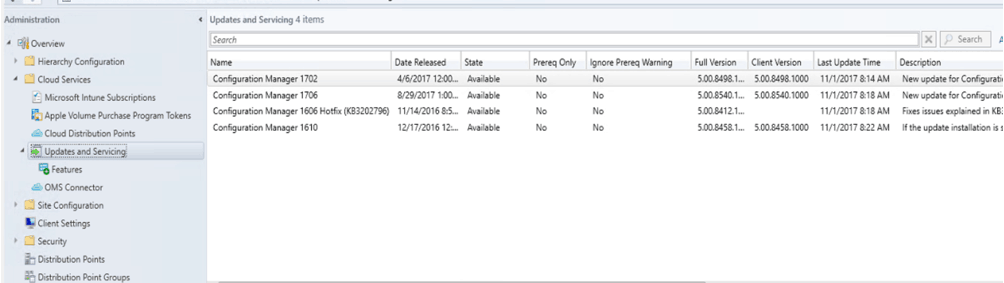 - Open the ConfigMgr console and navigate to Administration > Updates and Servicing. Updates that were imported and the Latest patch status are Ready to install.