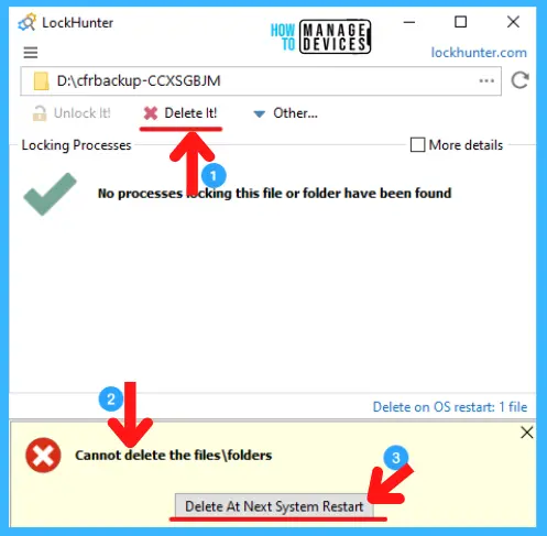 The lock hunter interface opens the next window and clicks on delete. If the application cannot delete that particular file, it shows the message “Cannot delete files/folders” under it; an option button is available as Delete At Next System Restart; click on it.