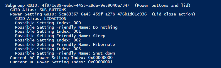 Note the Subgroup GUID and the Power Setting GUID, which we will use to prepare the command to set the appropriate index value for the settings.