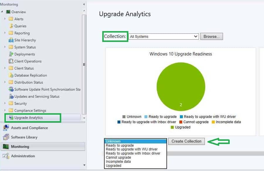 We can monitor and create new SCCM collections based on the assessments provided by Upgrade Readiness. This is possible if you integrate with SCCM. Refer to post 2 for more details about the integration. The following are options that we can view from the SCCM console