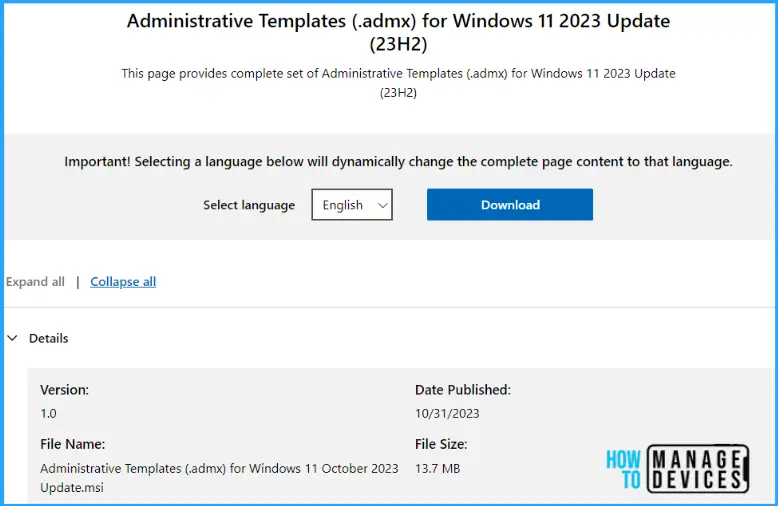 - Browse to Microsoft Download Center, Download Administrative Templates (.admx) for Windows 11 23H2